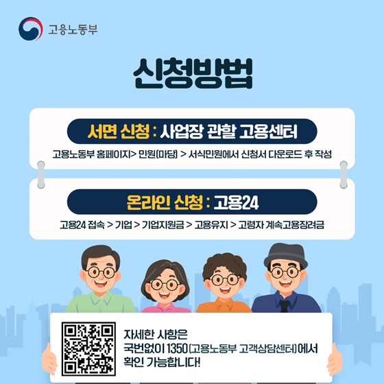 ✔ 온라인 신청: 고용24 (work24.go.kr) 접속 → 기업지원금 → 고용유지 → 고령자 계속고용장려금 메뉴에서 신청