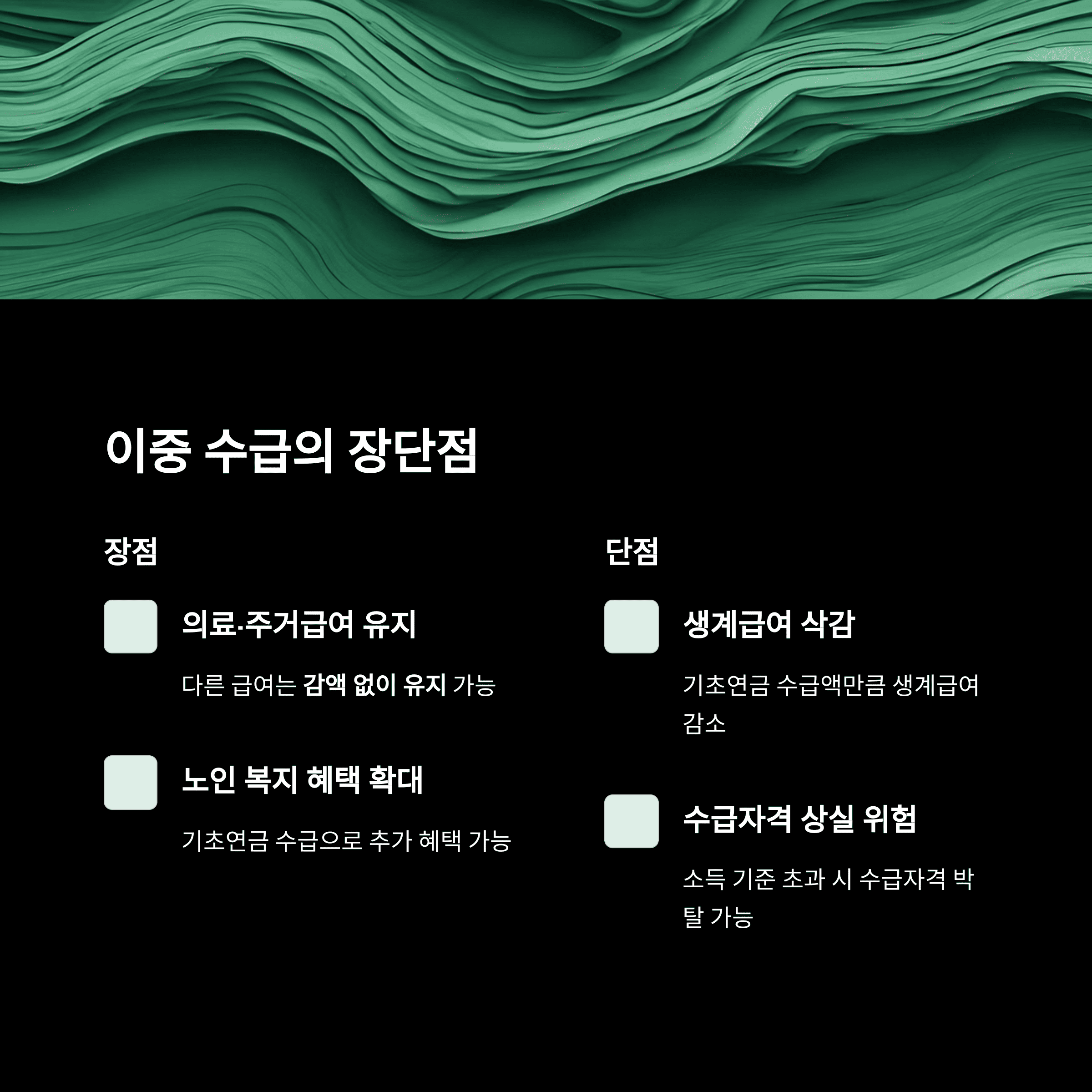 • 기초연금이 소득으로 간주되어 기준 초과 시 수급자 자격 박탈 가능성