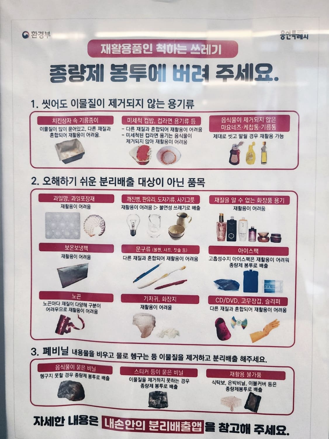 - 음식물이 묻은 비닐: 종량제 봉투에 배출