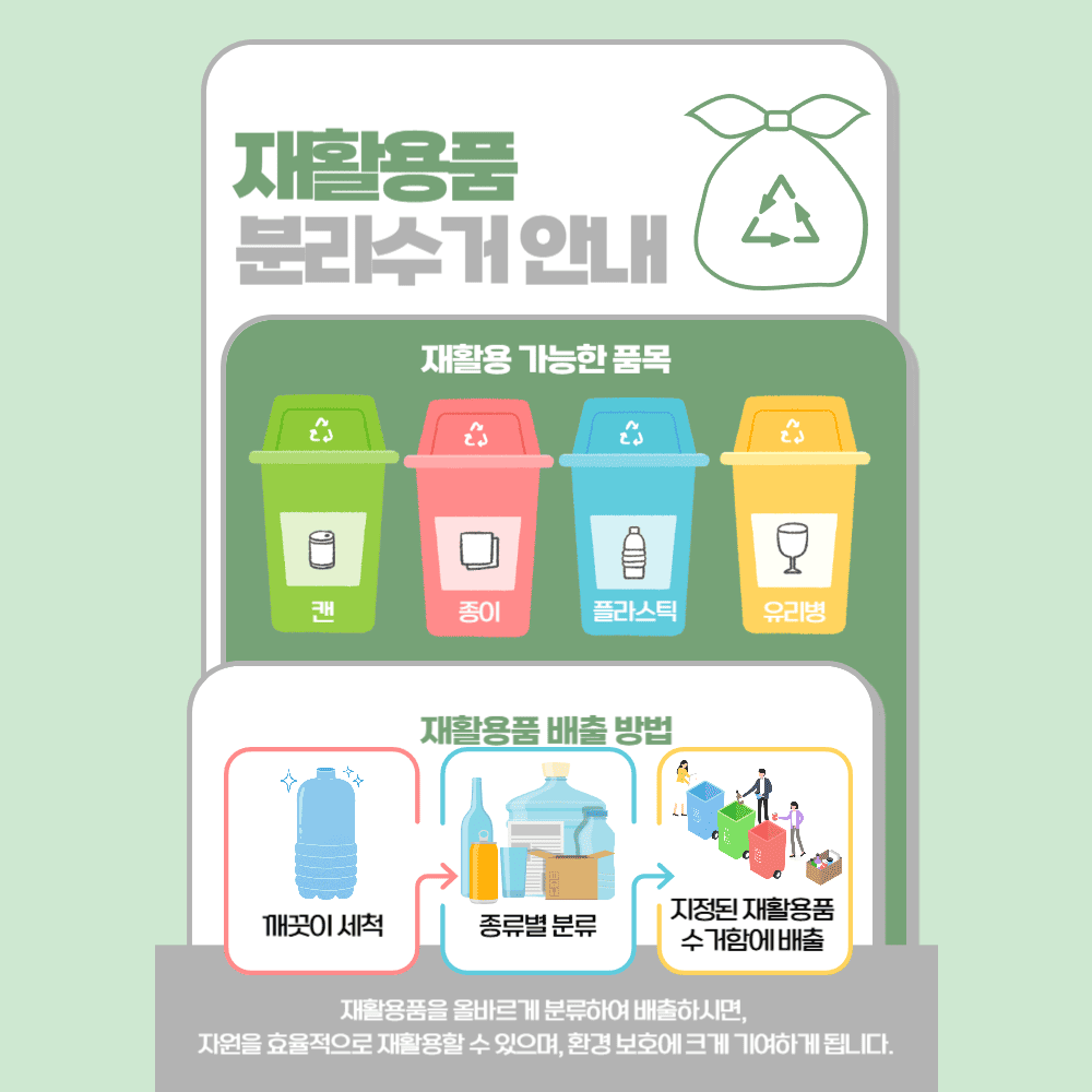 올바른 분리배출은 작은 실천이지만, 환경 보호에는 큰 영향을 미칩니다. 무심코 버린 오염된 재활용품 하나가 모든 자원을 쓰레기로 만들 수 있다는 점, 꼭 기억해주세요.