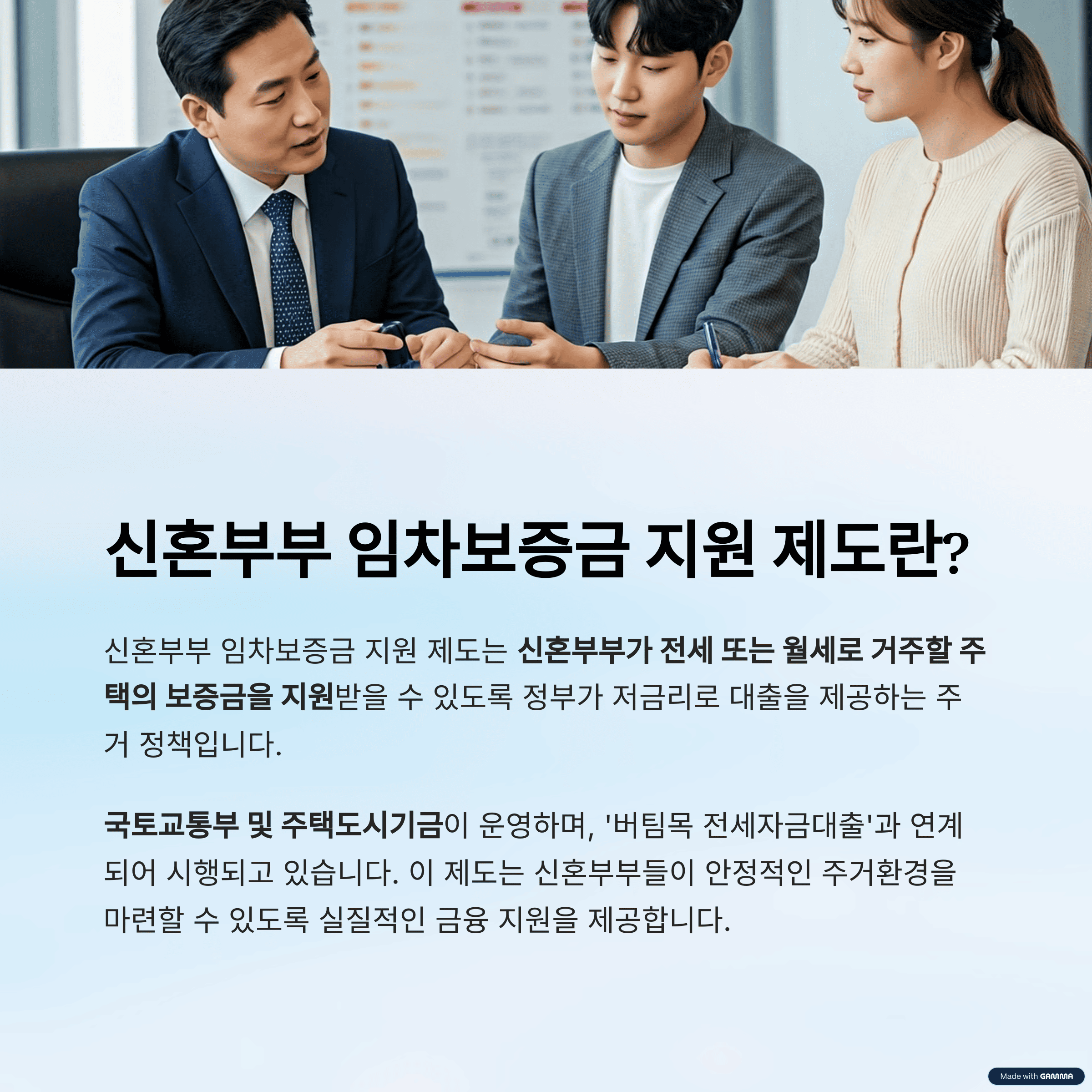 신혼부부 임차보증금 지원 제도는 신혼부부가 전세 또는 월세로 거주할 주택의 보증금을 지원받을 수 있도록 정부가 저금리로 대출을 제공하는 주거 정책입니다.
