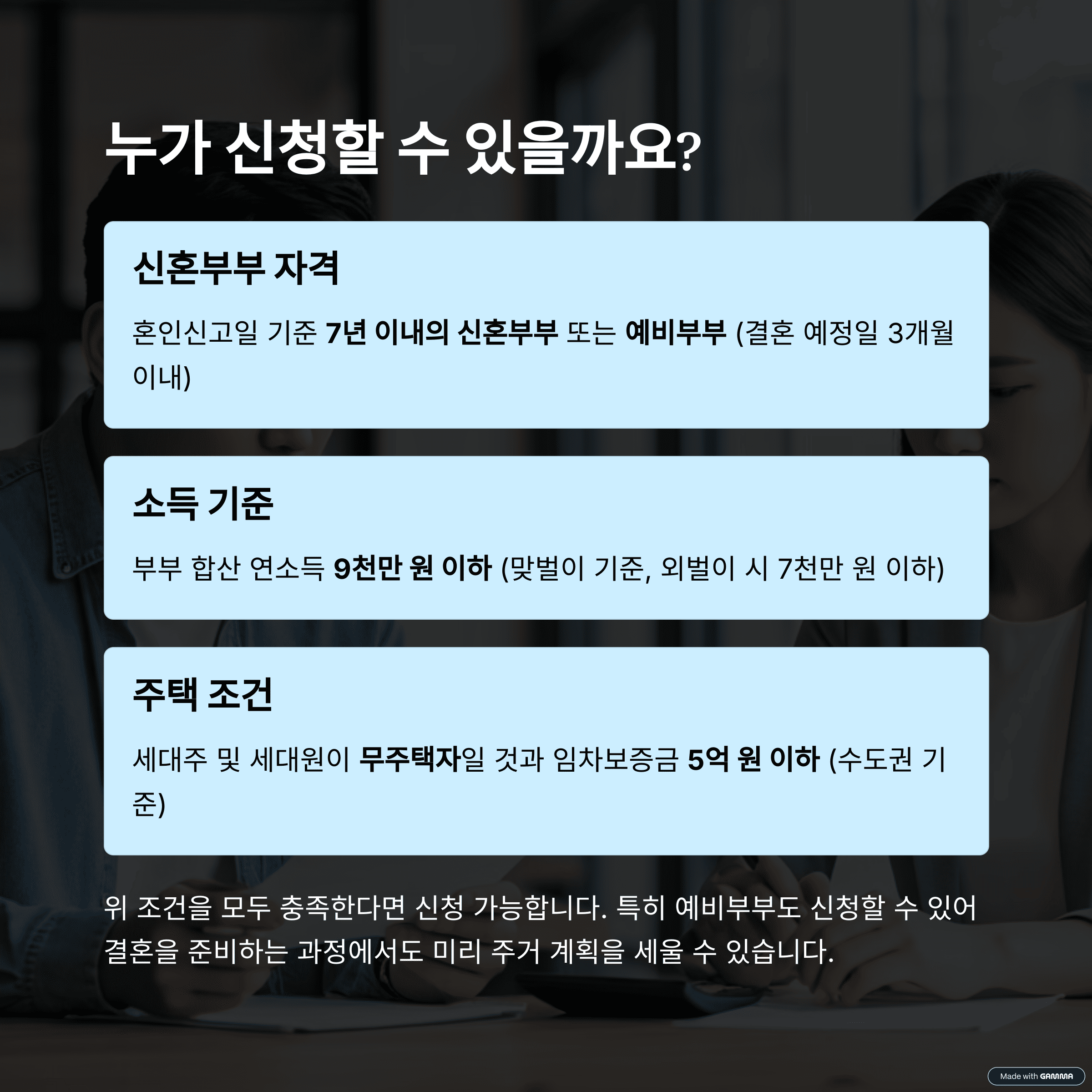 - 지원 대상: 혼인신고일 기준 7년 이내 신혼부부