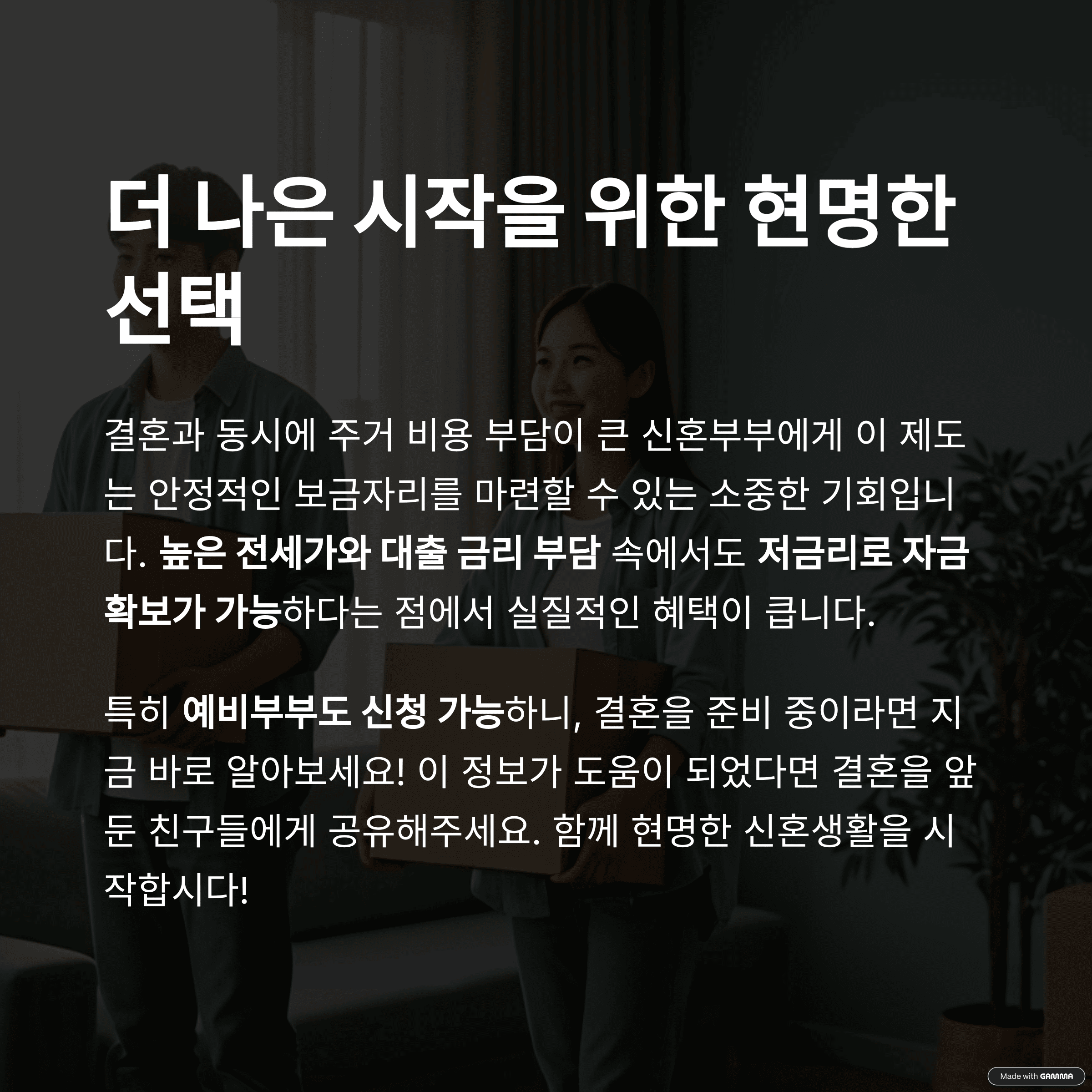 결혼과 동시에 주거 비용 부담이 큰 신혼부부에게 안정적인 보금자리를 마련해주는 제도는 매우 중요합니다.