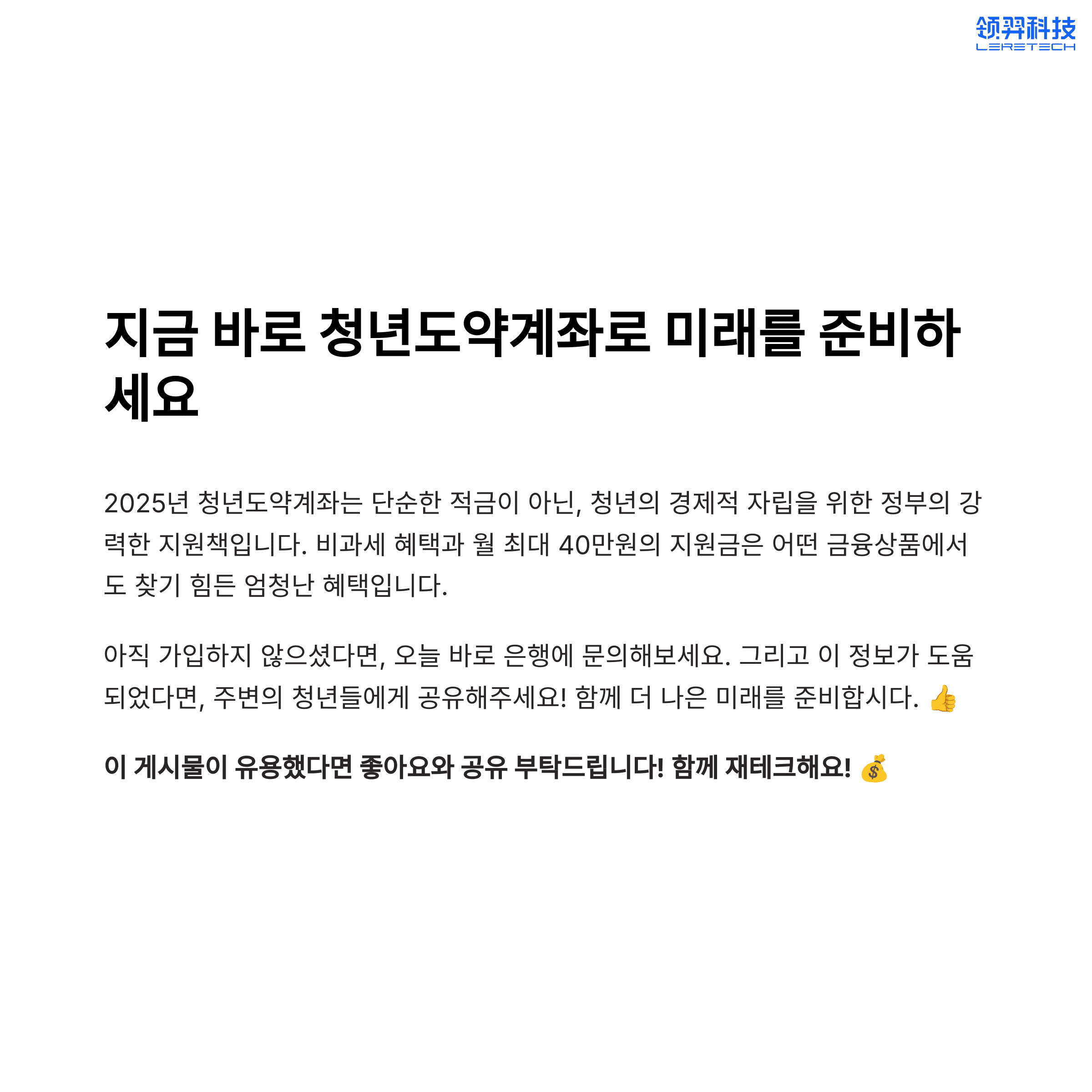 2025년 청년도약계좌는 단순한 적금을 넘어, 정부의 강력한 지원을 통해 사회초년생에게 실질적인 자산 형성 기회를 제공합니다. 특히 비과세 혜택과 월 최대 40만 원의 지원은 어떤 금융상품에서도 찾기 힘든 장점입니다.