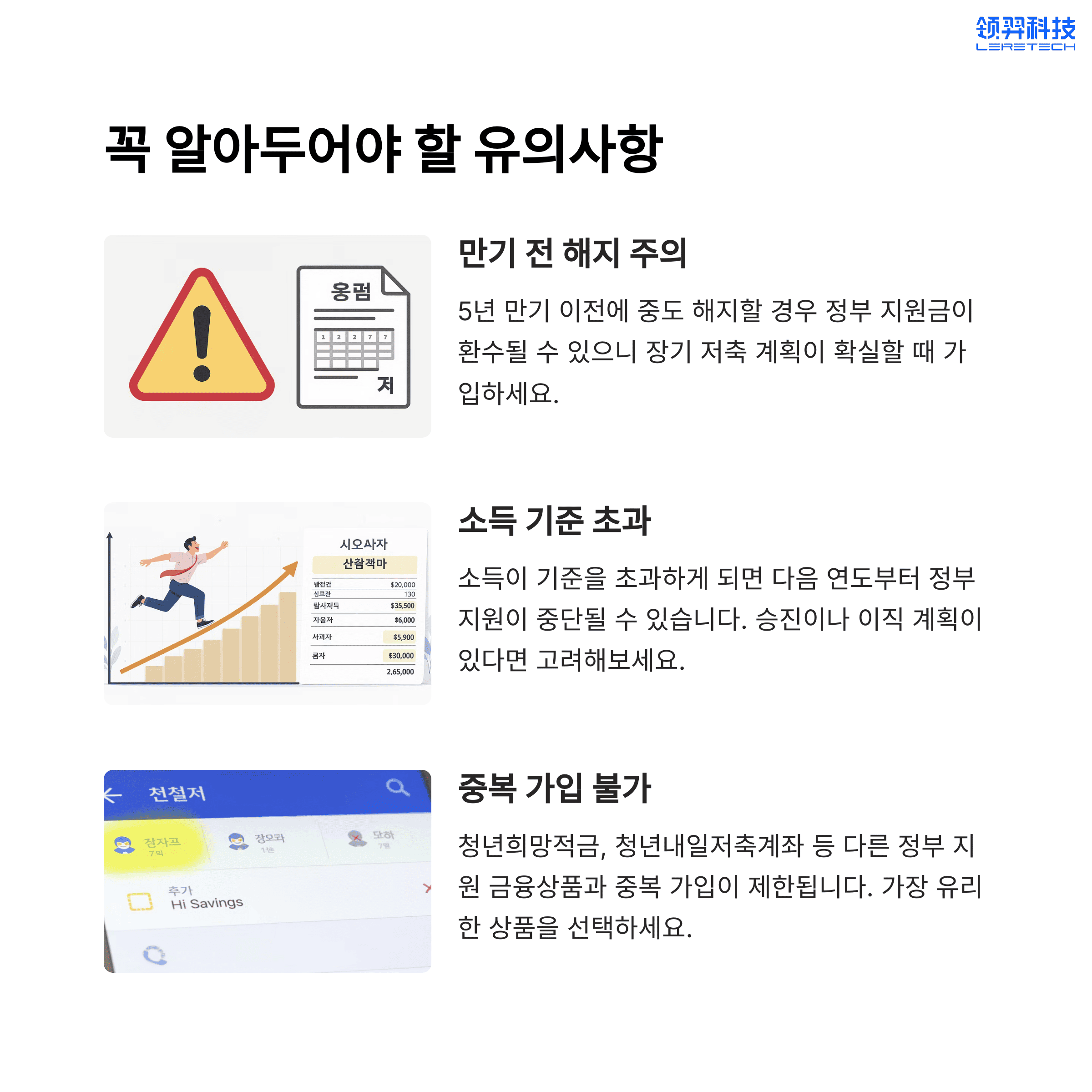 - 중복 가입 불가: 청년희망적금, 청년내일저축계좌 등과 중복 가입 제한