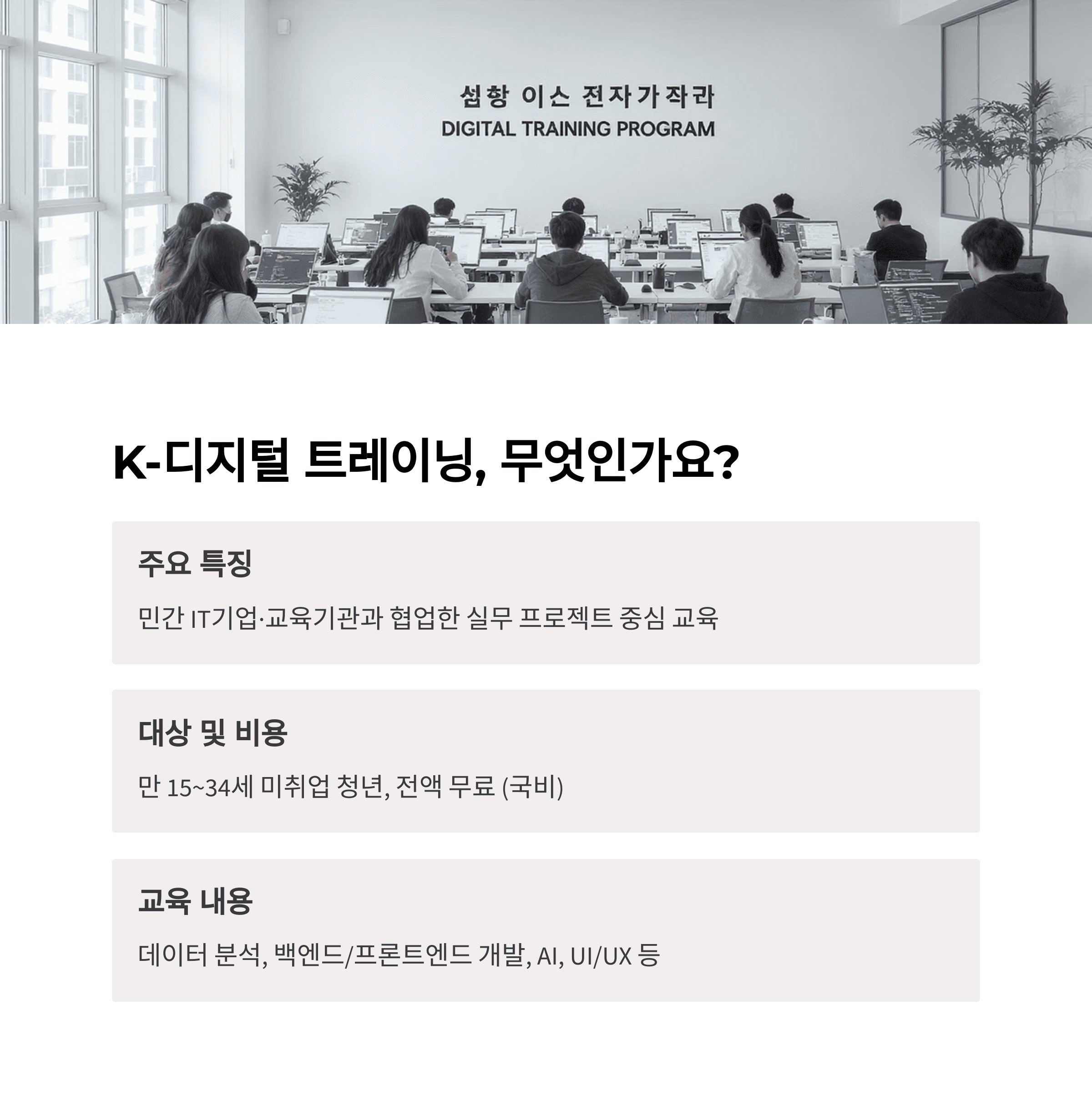 'K-디지털 트레이닝(K-Digital Training)'은 고용노동부가 주관하는 청년 디지털 인재 양성 사업입니다.