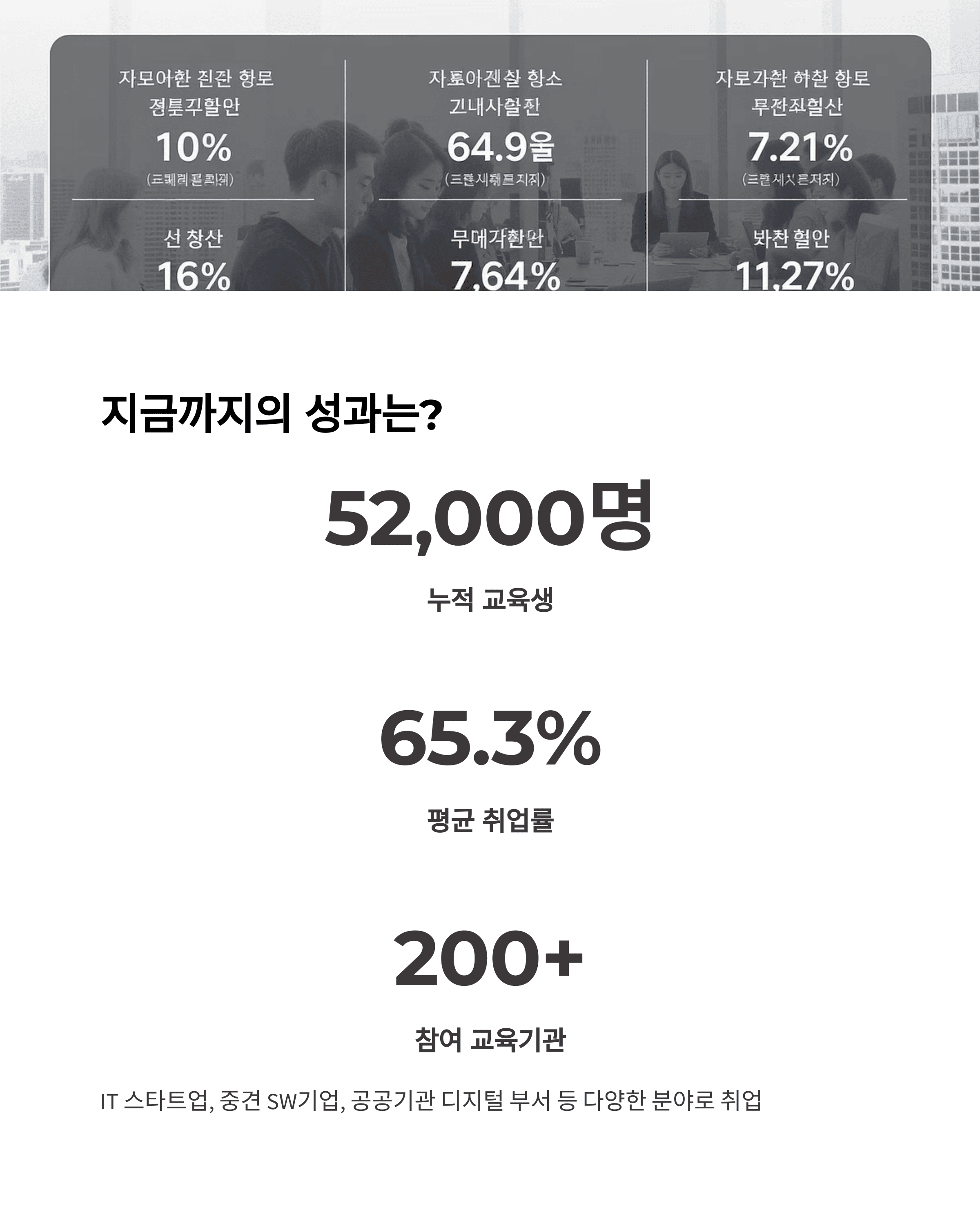 2025년 현재까지 누적 수강생 5만 명 돌파, 수료자 취업률 65% 이상이라는 성과를 기록하며, 대표적인 공공 디지털 인재 육성 정책으로 자리잡고 있습니다.